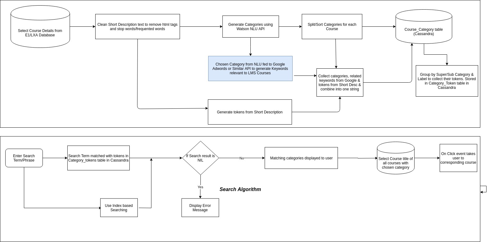Logic behind Guided Search is to classify all the courses in an enterprise based on Title and/or Short description of the Course. Classification is performed through IBM Watson's Natural Language Understanding suite. IBM's NLU suite has the ability to analyse the presented text and its metadata to extract concepts, entities and related categories using a simple API framework. The categories are presented as a multi-level hierarchy and can be further tuned and processed.